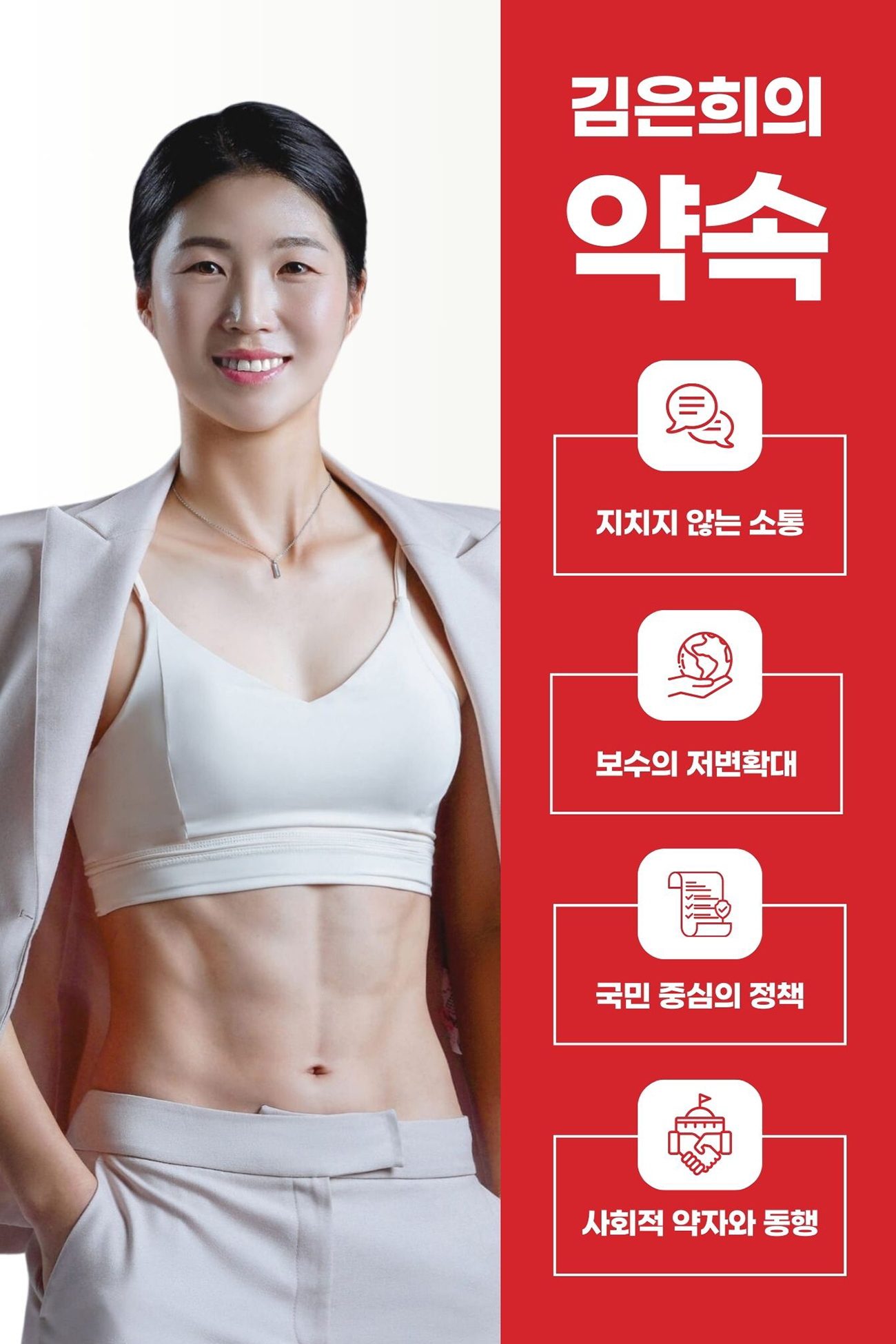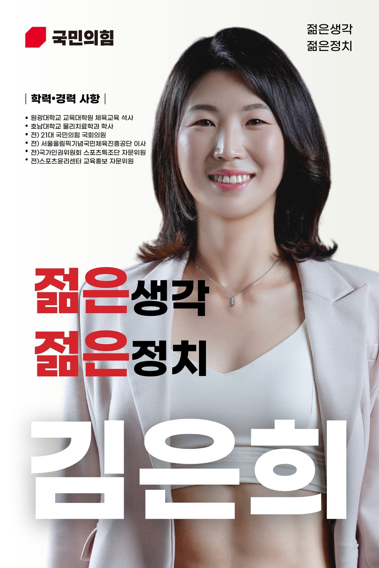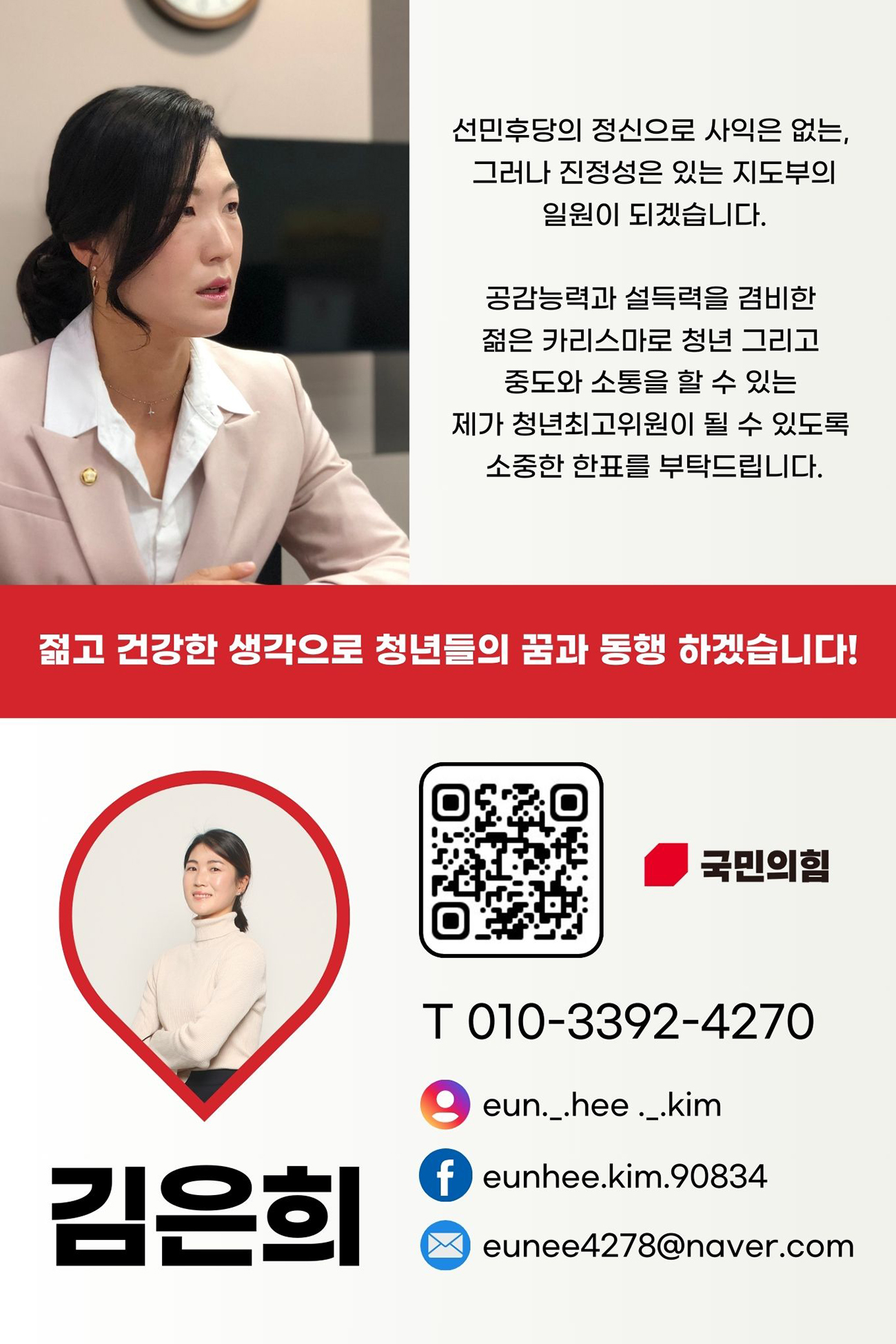 저는 공감 능력과 설득력을 겸비한 젊은 카리스마로 청년 그리고 중도와 소통을 할 자신이 있습니다. 제가 청년최고위원이 되어 보수의 가치와 철학을 신뢰하는 누구라도 국민의힘의 주류가 될 수 있다는 희망을 가질 수 있도록 저에게 소중한 한 표 부탁드리겠습니다.