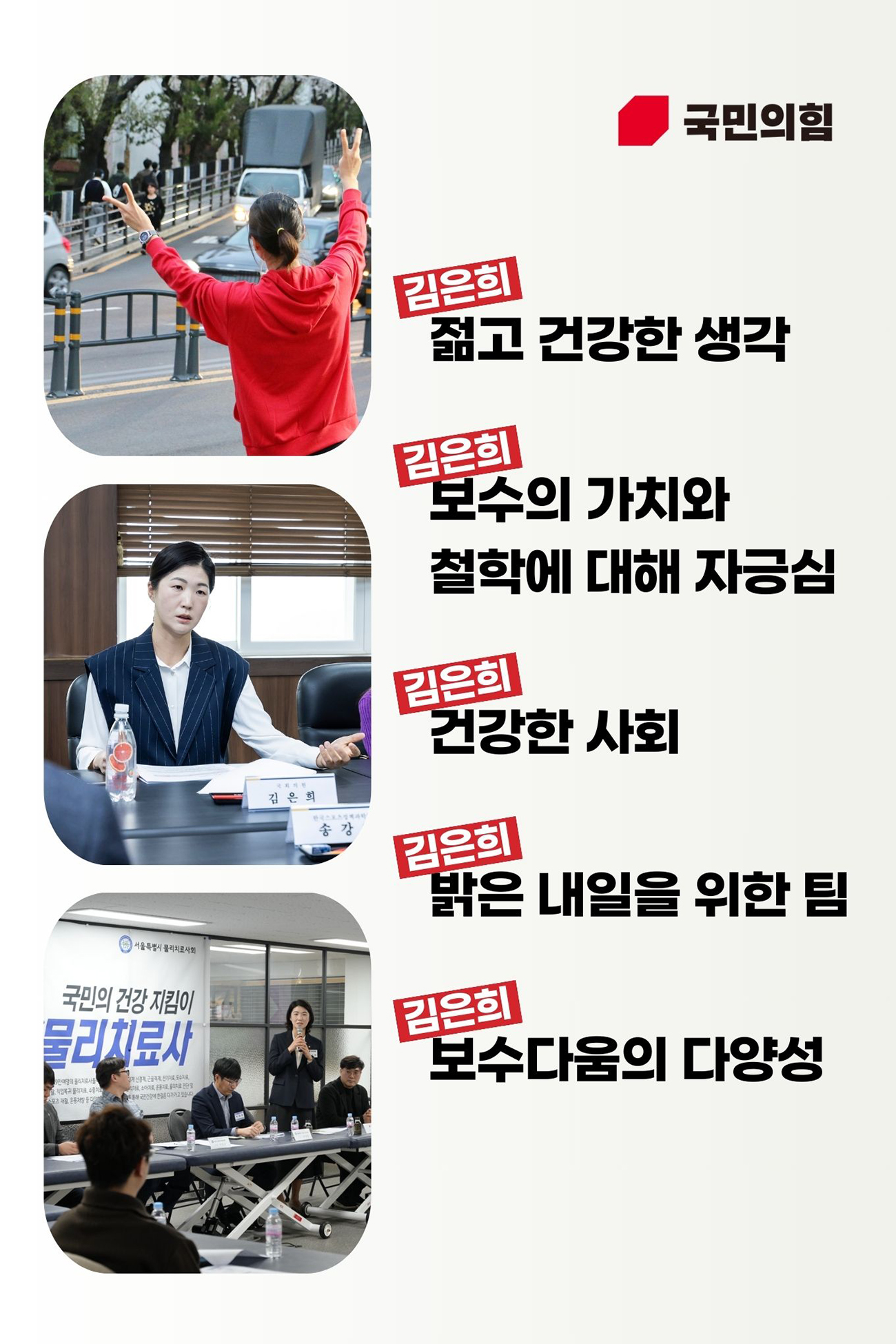 지금 청년들은 심적으로 많은 어려움과 아픔을 겪고 있습니다. 우리 정당이 청년들의 밝은 내일이 되고 희망찬 미래가 되어야 합니다. 보수의 가치와 철학을 신뢰하는 청년과 중도가 많아질수록 사회는 더욱 건강해질 것입니다.
