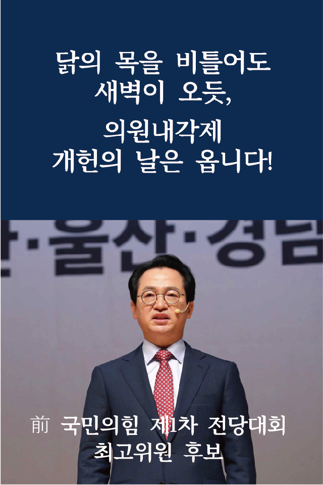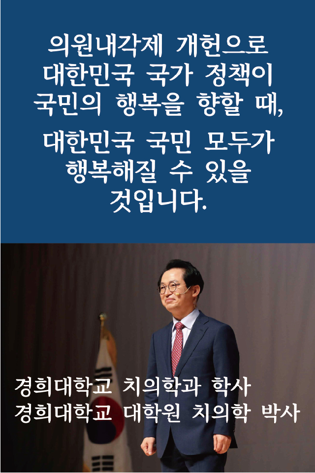 - 의원내각제 개헌으로 대한민국 국가 정책이 국민의 행복을 향할 때 대한민국 국민 모두가 행복해질 수 있을 것임.