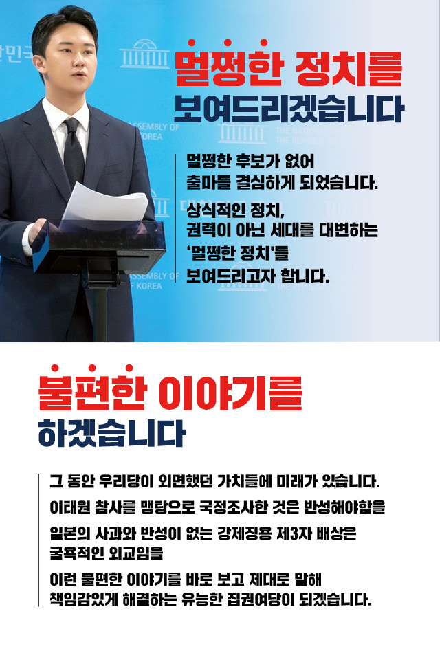 - 이태원 참사, 강제징용 제3자배상 등 그 동안 우리 당이 외면했던 가치들을 바로 보고 제대로 말해 책임감 있게 해결하겠습니다.