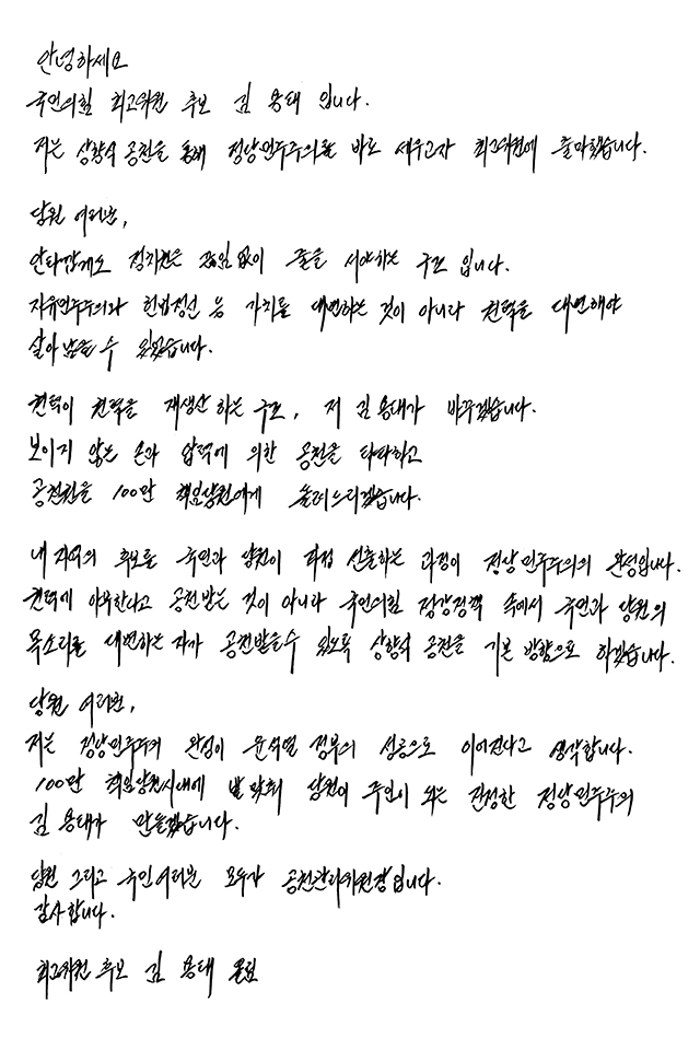 권력에 조아리고 아부해서 살아남는 정치꾼이 아니라, 오직 가치를 중심으로 국민과 당원을 대변하는 정치인이 정치적 성공을 이루는 새로운 바람을 만들고 싶습니다.