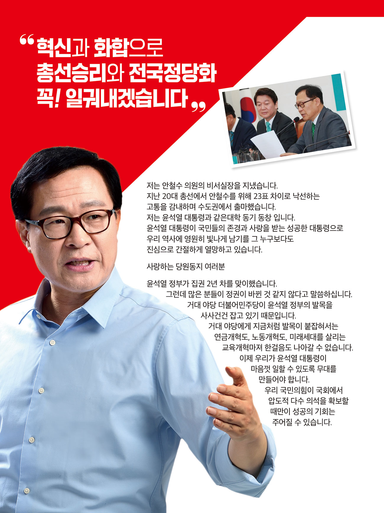 사랑하는 당원동지 여러분 윤석열 정부가 집권 2년 차를 맞이했습니다. 그런데 많은 분들이 정권이 바뀐 것 같지 않다고 말씀하십니다. 거대 야당에게 발목이 붙잡혀서는 연금개혁도 노동개혁도 할 수 없습니다. 그리고 미래세대를 살리는 교육개혁도 할 수 없습니다. 경제를 살리고, 국가안보를 지키고, 인구절벽과 기후변화의 위기를 극복하기 위한 그 어떠한 개혁도 불가능합니다.