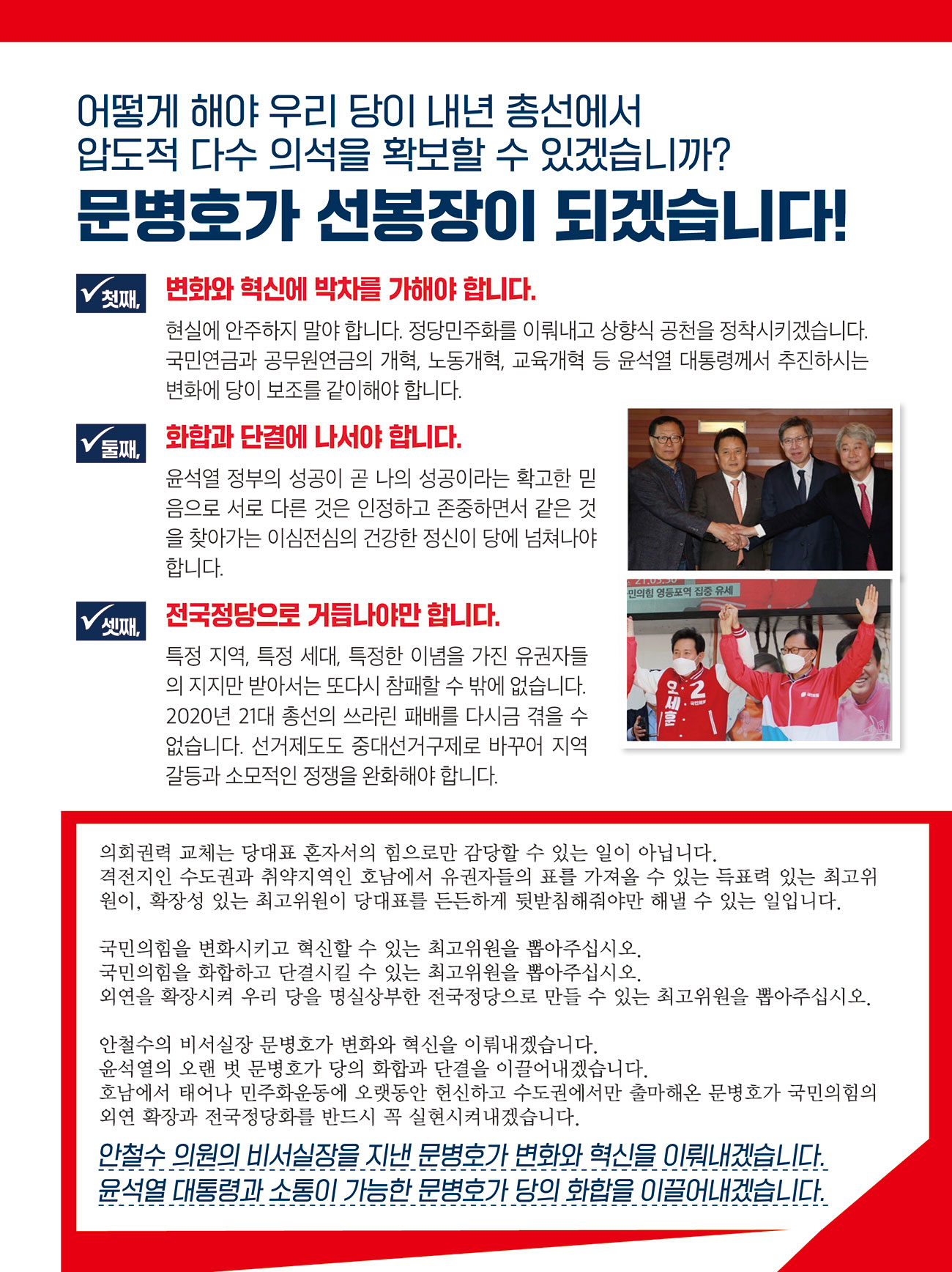 저는 오늘 국민의 힘의 변화와 혁신을 위해, 화합과 단결을 위해, 외연 확장과 전국정당화를 위해 최고위원 선거에 나갈 것을 말씀드립니다.