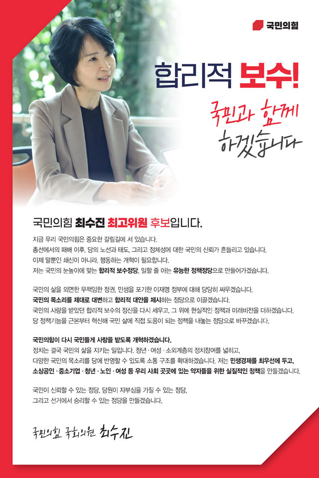 - 국민의 사랑을 받는 합리적 보수정당의 모습을 되찾겠습니다.
