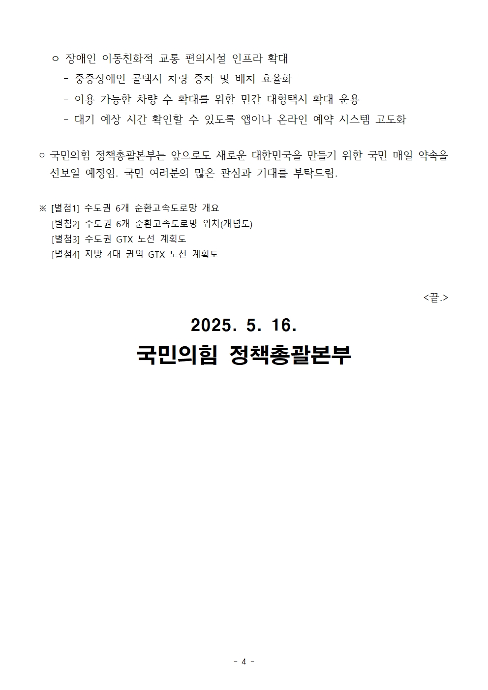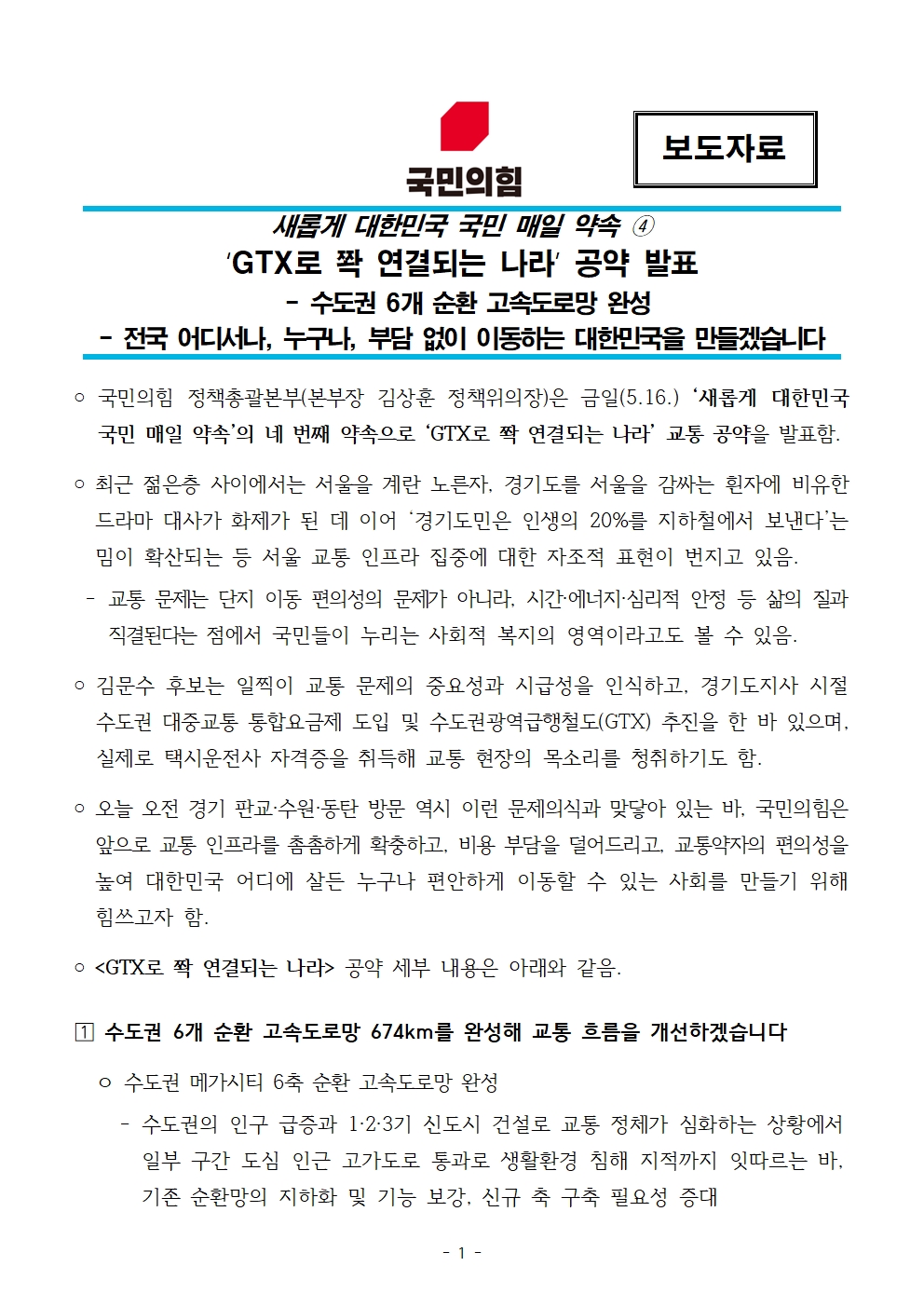 [보도자료] 국민의힘 '새롭게 대한민국 국민 매일 약속' 4. GTX로 쫙 연결되는 나라 공약 발표
