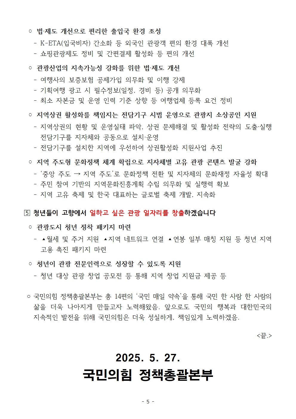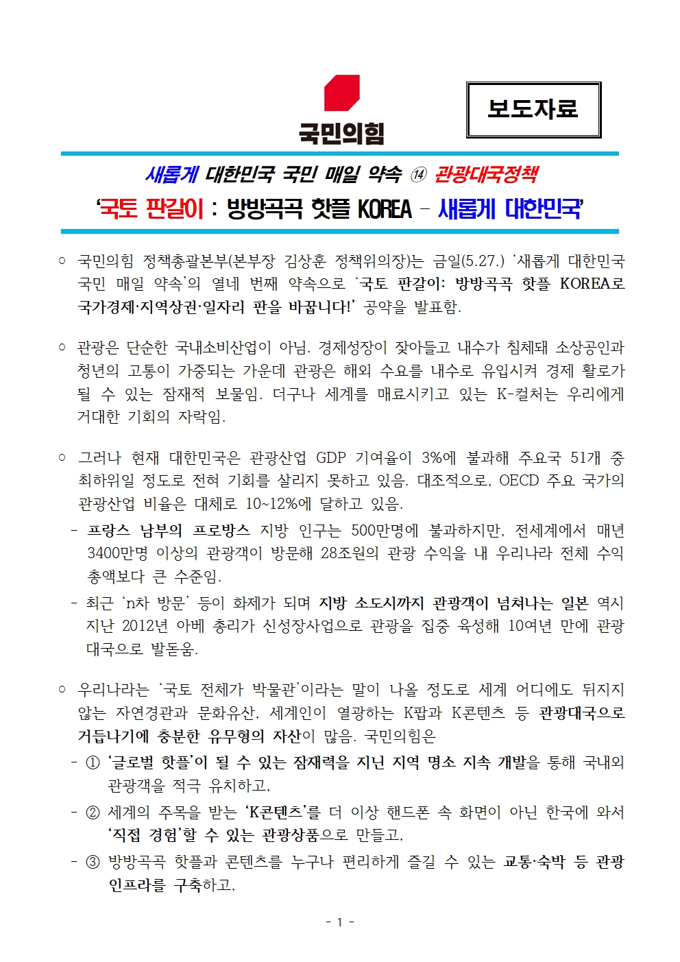[보도자료] 국민의힘 '새롭게 대한민국 국민 매일 약속' 14. '국토판갈이 - 방방곡곡 핫플 KOREA - 새롭게 대한민국' 공약 발표