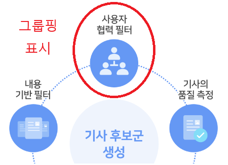여기서 “CF(Collaborative Filtering, 협업 필터)는 나와 관심사를 가진 사용자를 그룹을 묶어낸다”고 소개하면서 “그룹 내 인원들이 함께 많이 본 기사를 찾는다”고 밝히고 있다.
