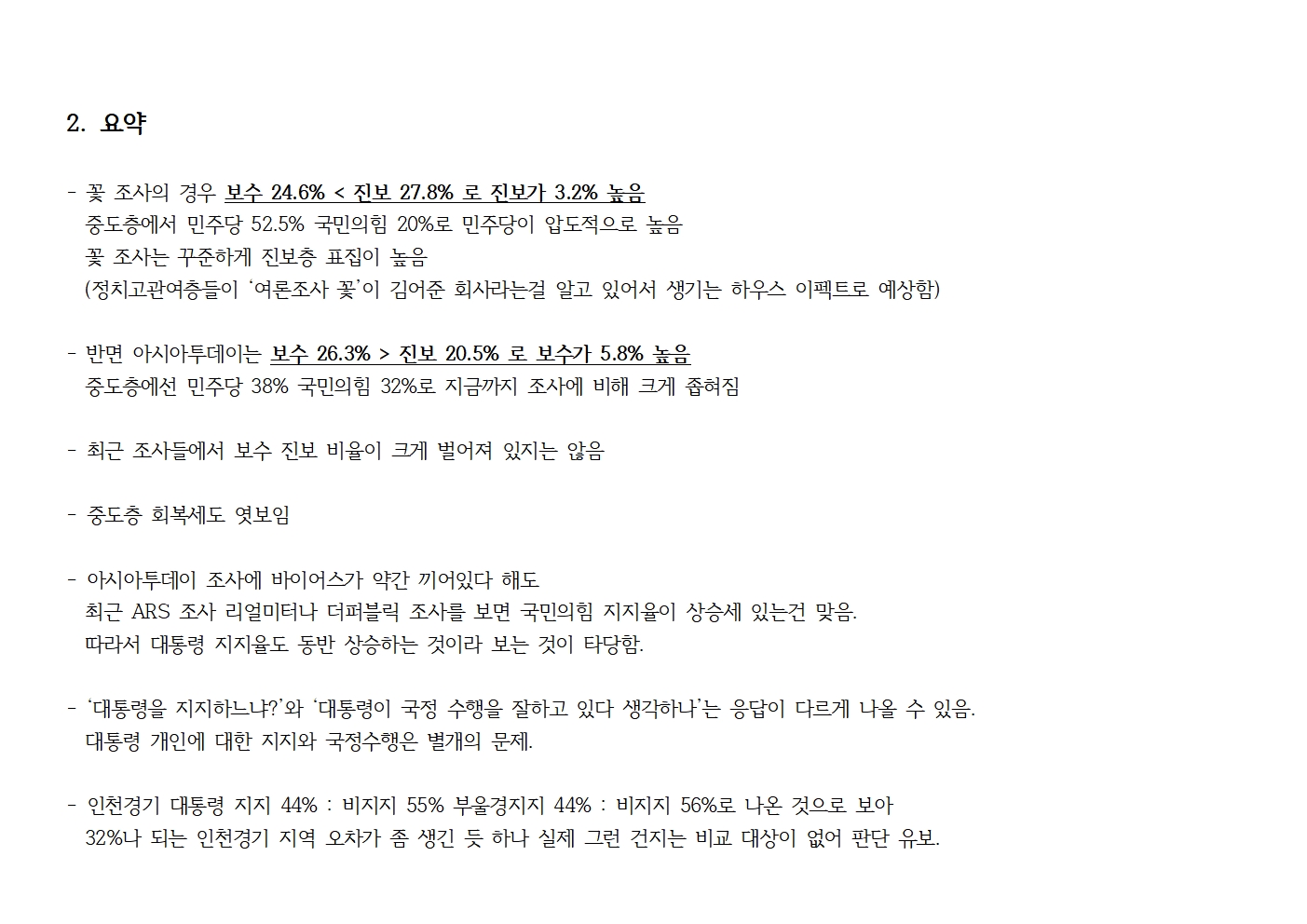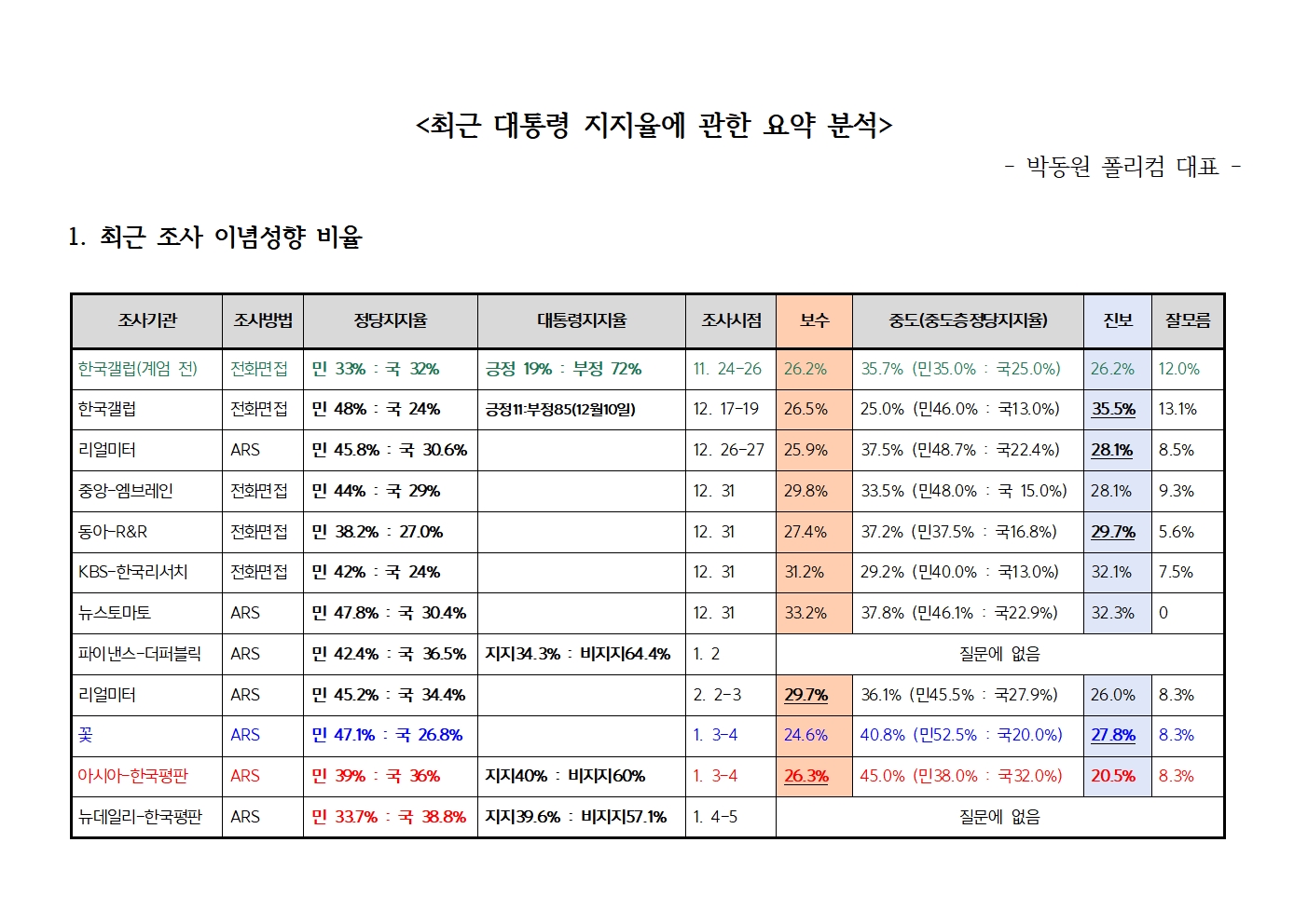 - 이에 대한 다른 근거로 여론조사 결과의 다른 항목들을 살펴보면 탄핵 후 진행되었던 각종 정치현안 여론조사들과 비교하여 보수성향 응답자와 진보성향 응답자의 비율이 유사하게 나왔습니다.
