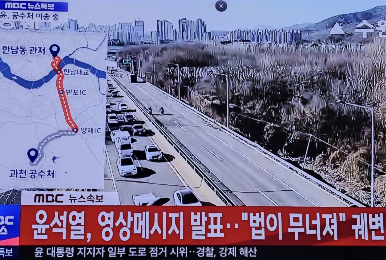 5. <MBC 뉴스속보>는 1. 15. 체포영장 집행 당시 윤석열 대통령의 영상 메시지를 보도하면서 자막에 윤 대통령의 발표를 ‘궤변’이라고 규정했다. 대통령의 발언을 근거 없이 즉석에서 ‘궤변이라고 매도한 것이다.