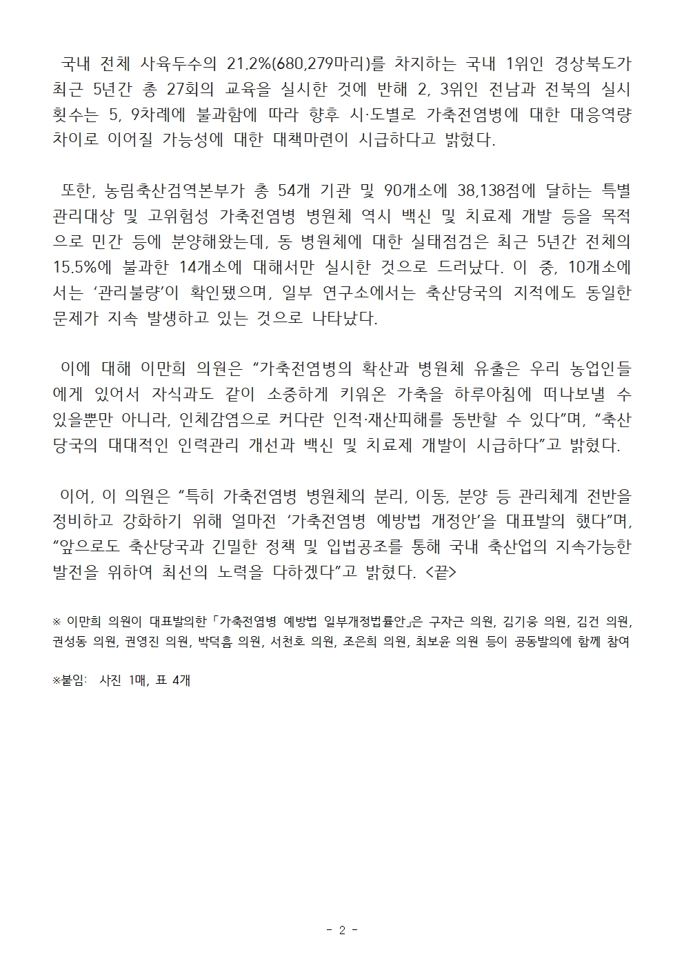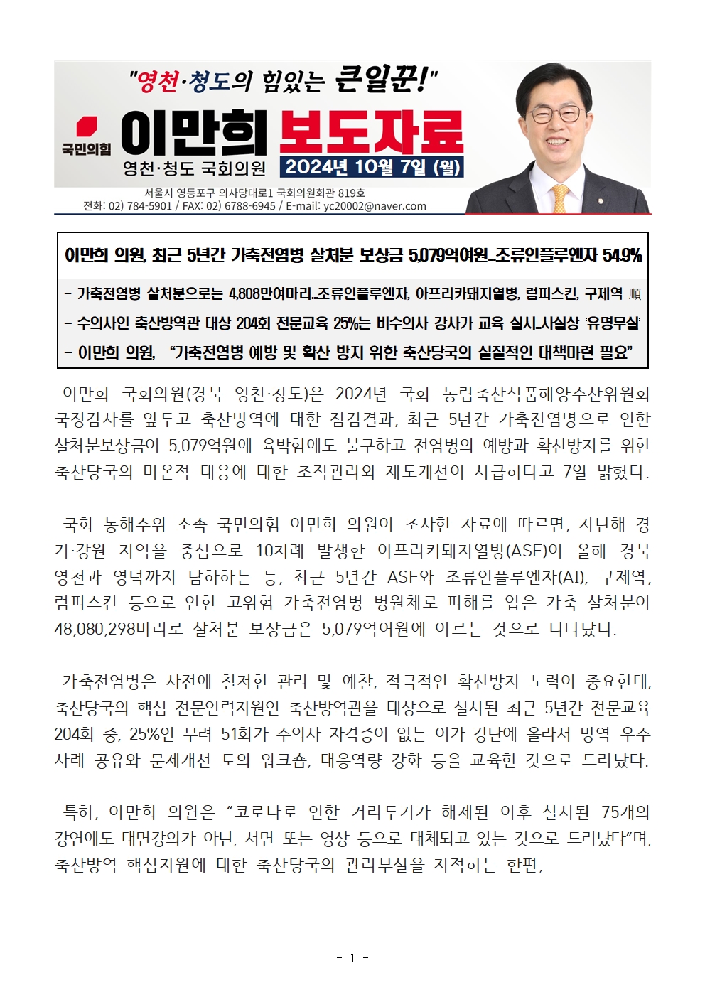 [이만희 의원/국감보도자료] 최근 5년간 가축전염병 살처분 보상금 5,079억여원...조류인플루엔자 54.9%