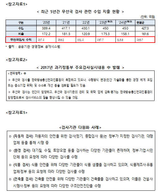KCA가 제출한 자료에 따르면, 최근 5년간 무선국 검사 수입은 연 평균 427.3억원이다. 반면 △측정장비 △검사차량 운영비 △지방본부 사업운영비 등 무선국 검사를 위한 지출은 연 평균 161.6억원으로 수입이 지출에 비해 2.6배나 높은 수준이다.