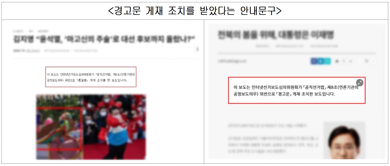 17건 중 3건은 동일 언론사가 선거운동 기간에 잇달아 보도했지만 기사 상단에 ‘경고문’게재 조치에 불과