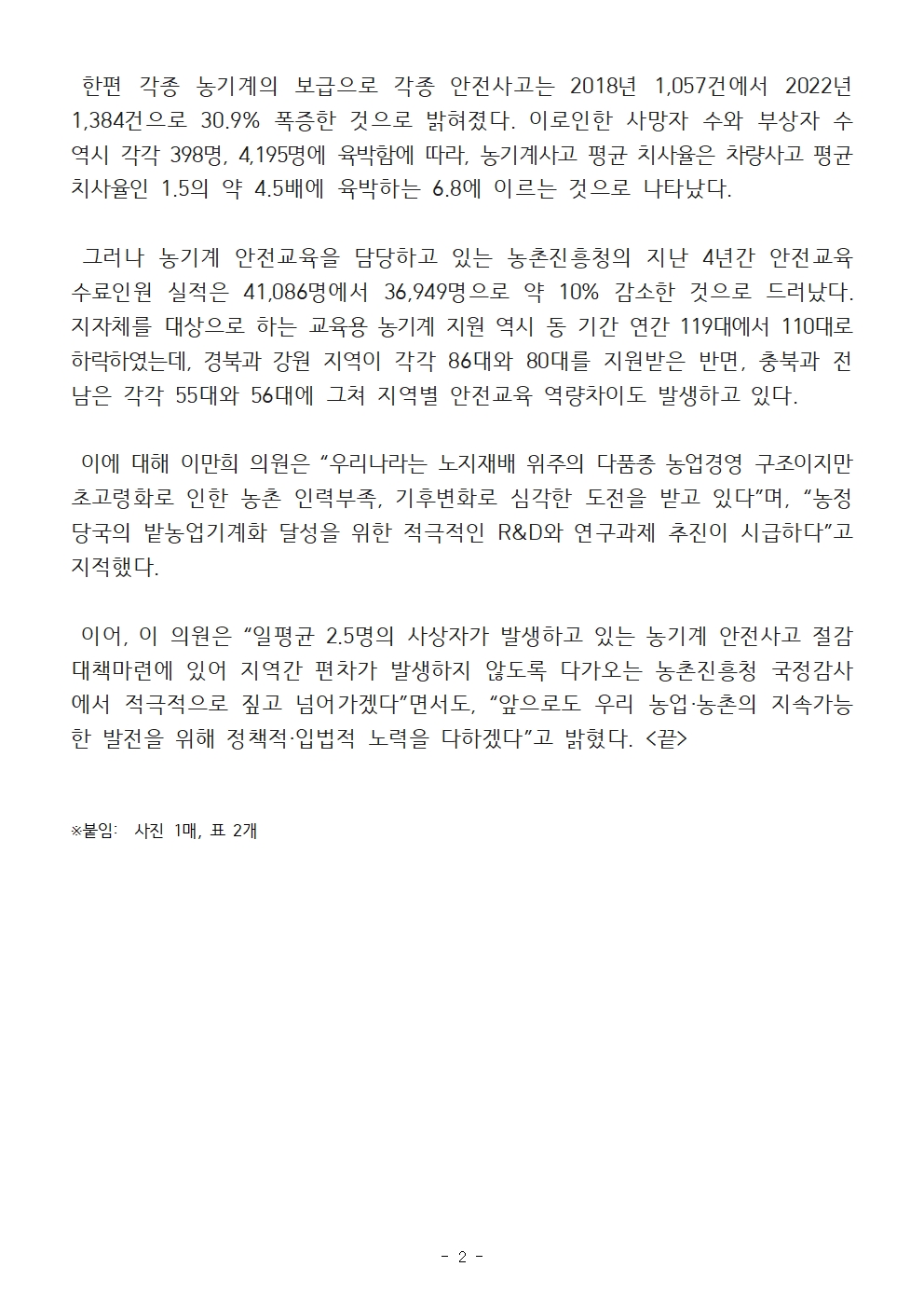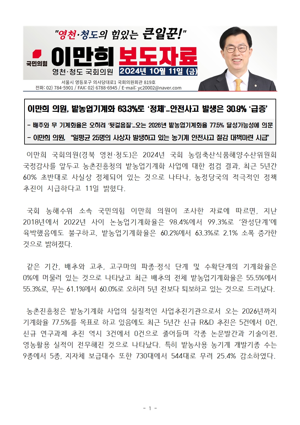 [이만희 의원/국감보도자료] 밭농업기계화 63.3%로 ‘정체’...안전사고 발생은 30.9% ‘급증’