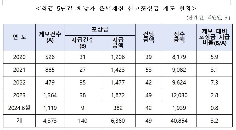 다만 은닉재산 신고 대비 포상금 지급비율은 3.2%에 불과한 것으로 확인됐다.