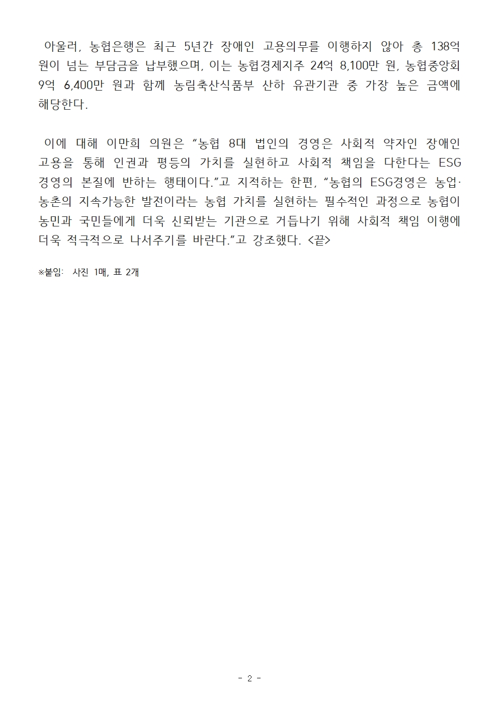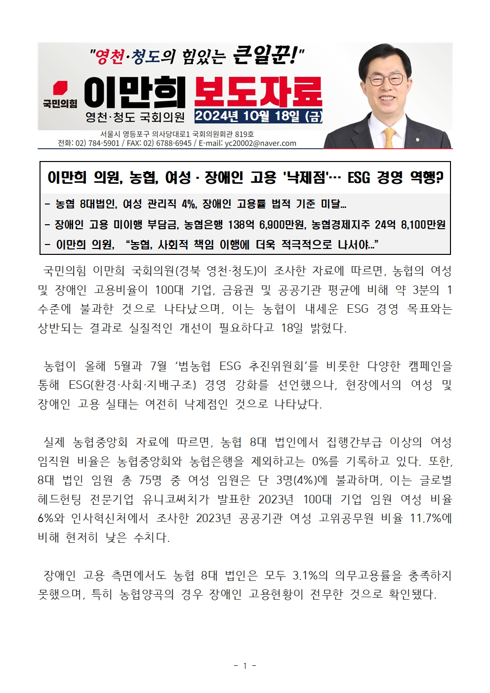 [이만희 의원/국감보도자료] 농협, 여성·장애인 고용 '낙제점'… ESG 경영 역행?