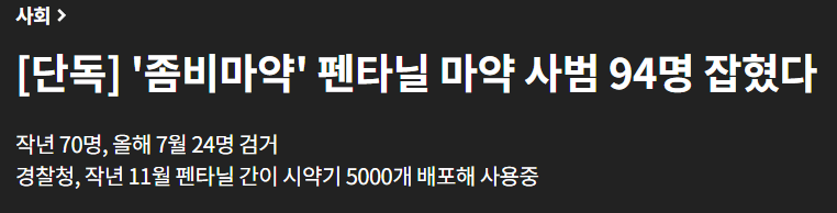 일명 ‘좀비 마약’으로 불리는 ‘펜타닐’ 마약류 사범이 통계를 작성하기 시작한 작년부터 올해 7월까지 94명으로 집계됐다.