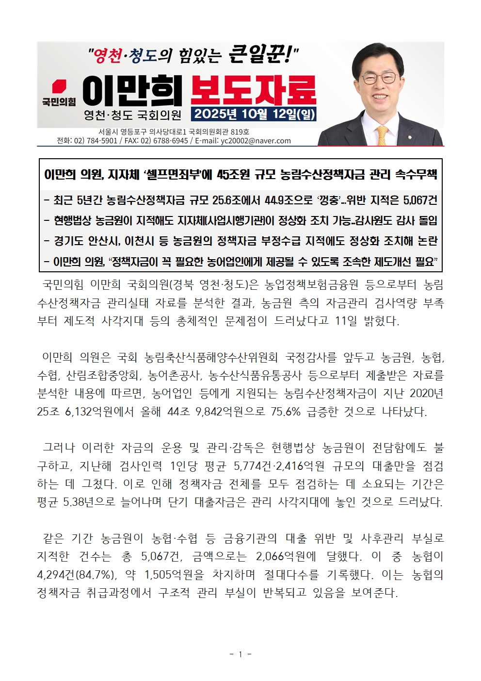 [이만희 의원/국감보도자료] 지자체 ‘셀프면죄부’에 45조원 규모 농림수산정책자금 관리 속수무책