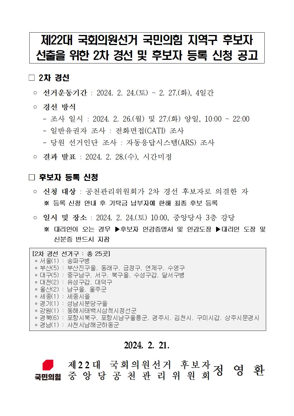 제22대 국회의원선거 국민의힘 지역구 후보자 선출을 위한 2차 경선 및 후보자 등록 신청 공고