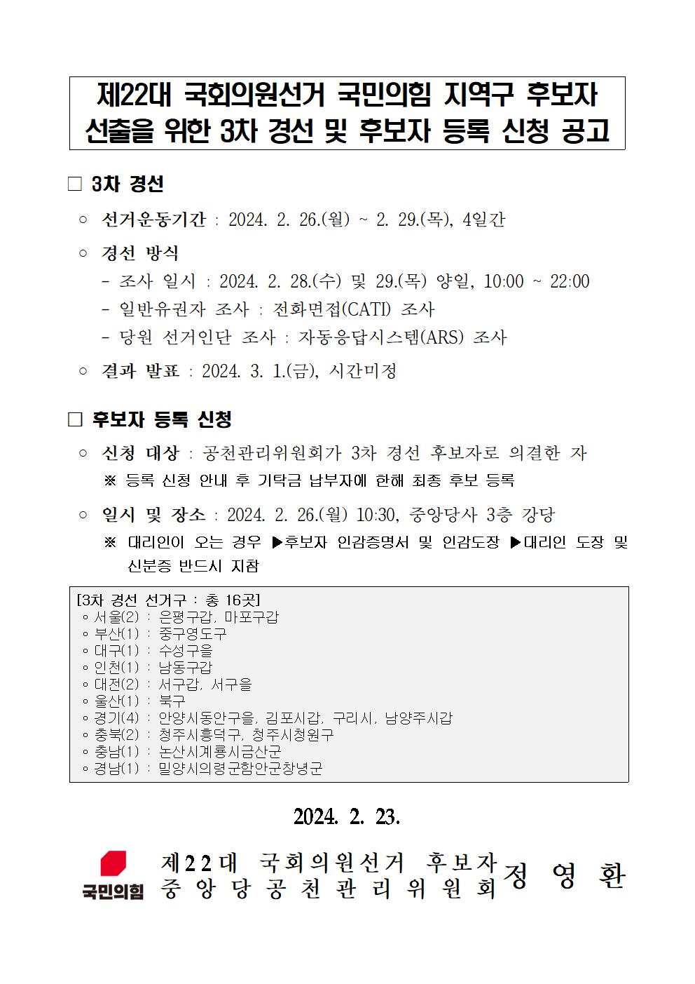 제22대 국회의원선거 국민의힘 지역구 후보자 선출을 위한 3차 경선 및 후보자 등록 신청 공고
