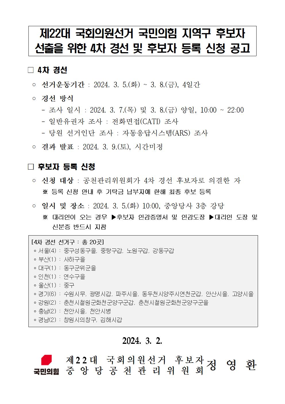 제22대 국회의원선거 국민의힘 지역구 후보자 선출을 위한 4차 경선 및 후보자 등록 신청 공고