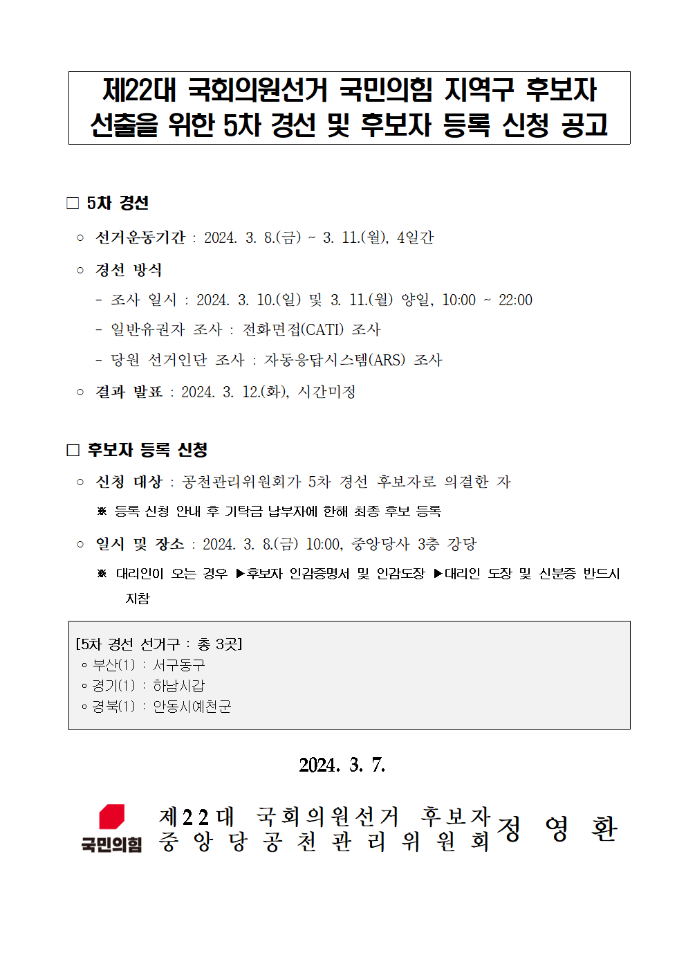 제22대 국회의원선거 국민의힘 지역구 후보자 선출을 위한 5차 경선 및 후보자 등록 신청 공고