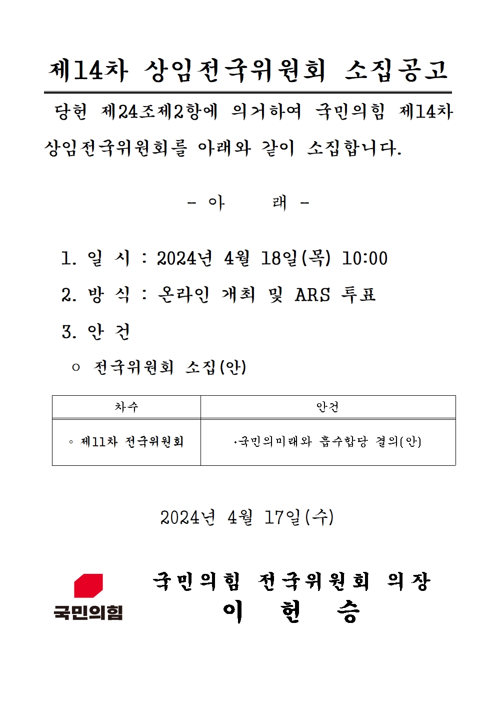 제14차 상임전국위원회 소집 공고