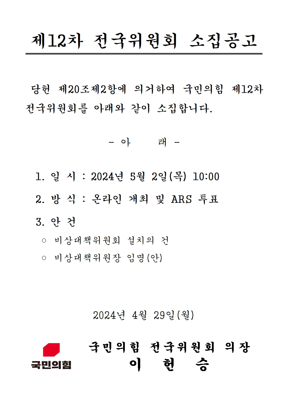 제12차 전국위원회 소집 공고