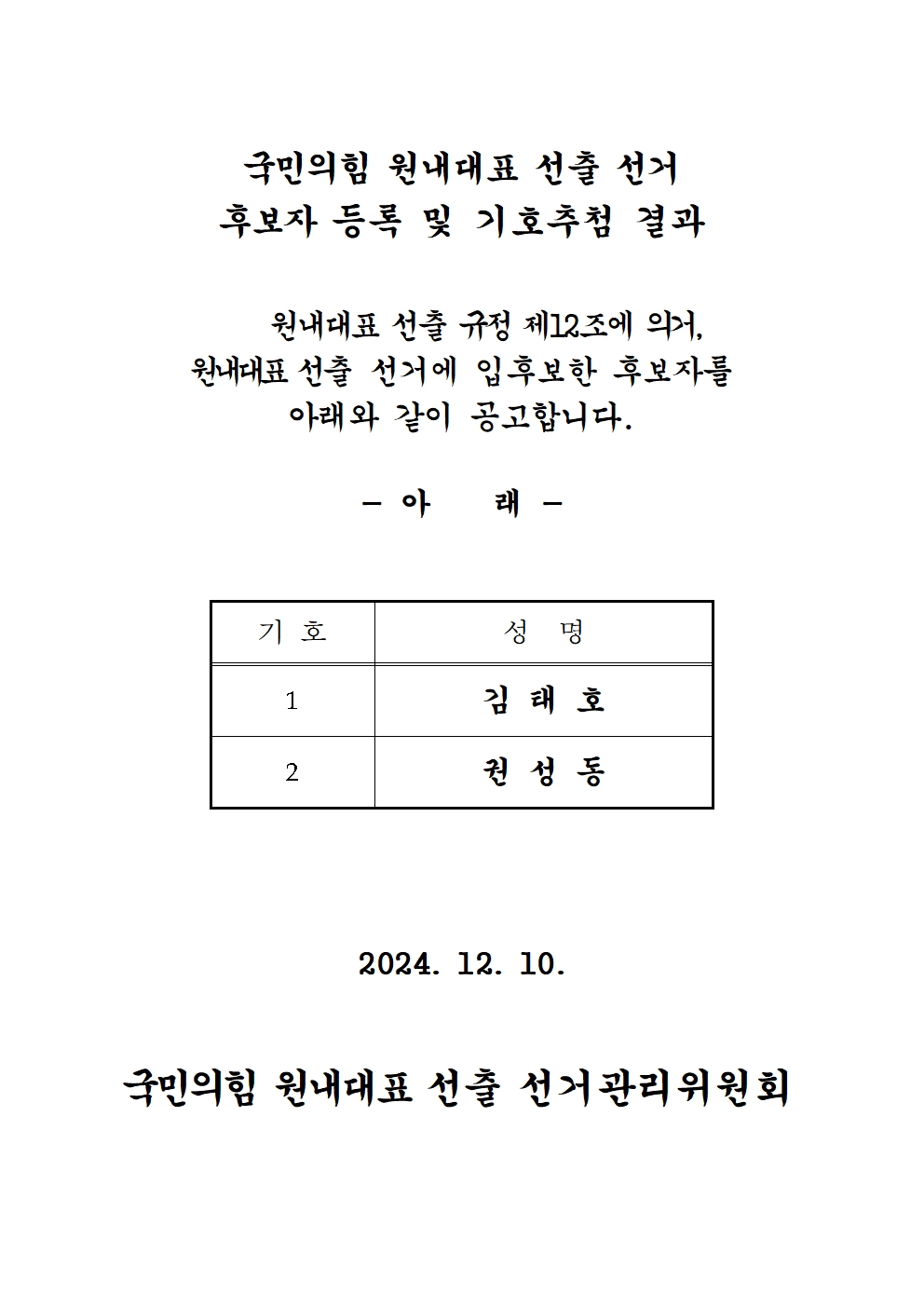 국민의힘 원내대표 선출 선거 후보자 등록 및 기호추첨 결과