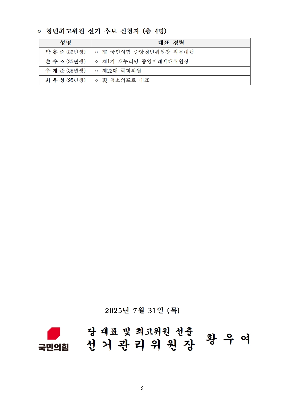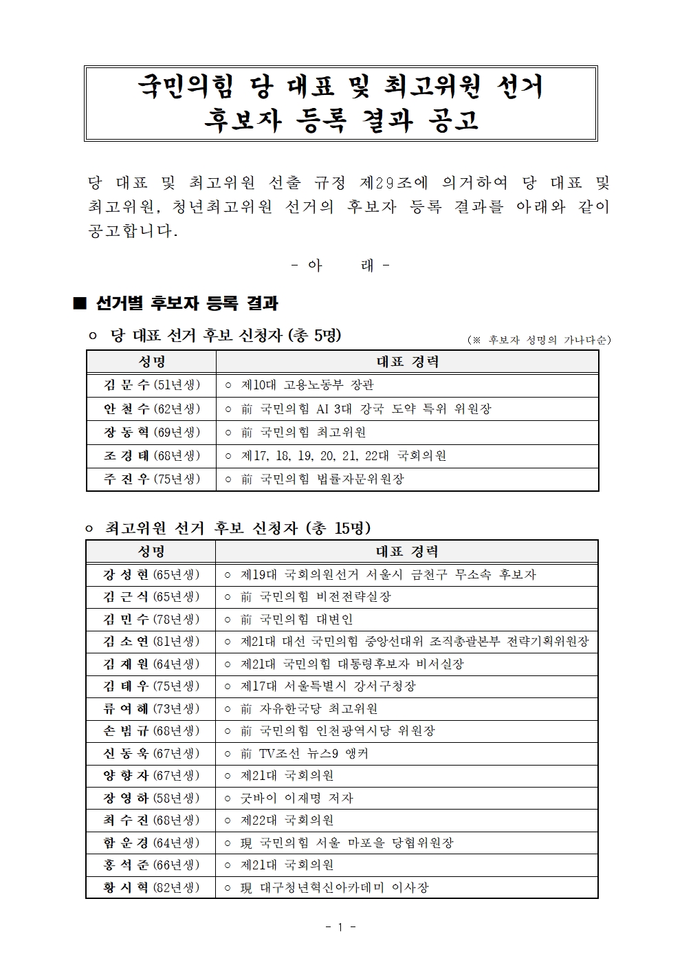 국민의힘 당 대표 및 최고위원 선거 후보자 등록 결과 공고