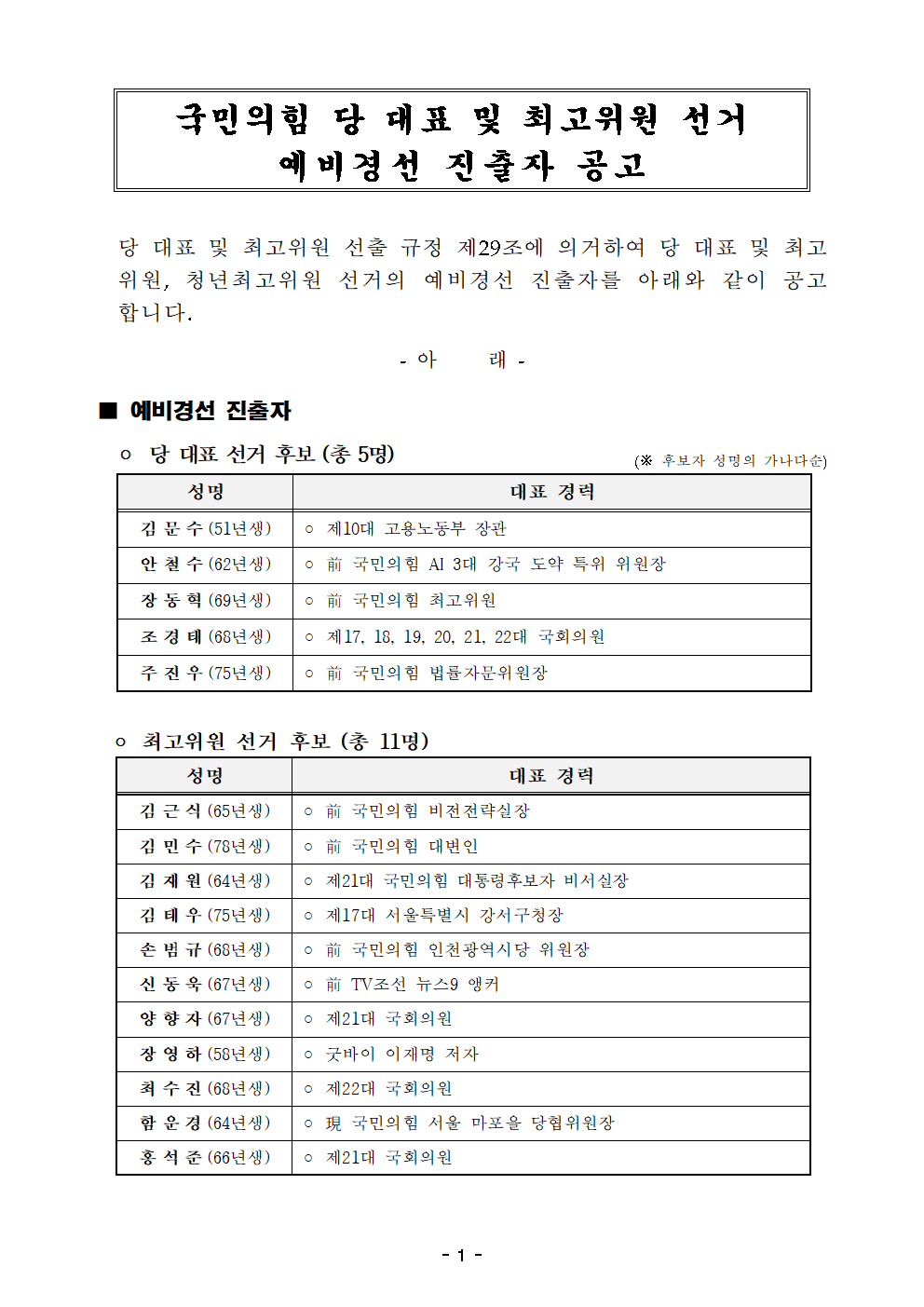 국민의힘 당 대표 및 최고위원 선거 예비경선 진출자 공고