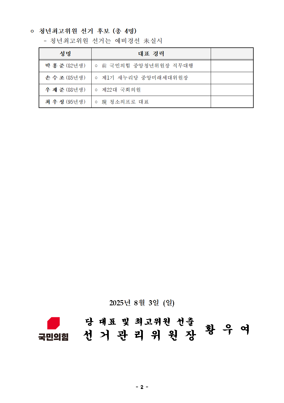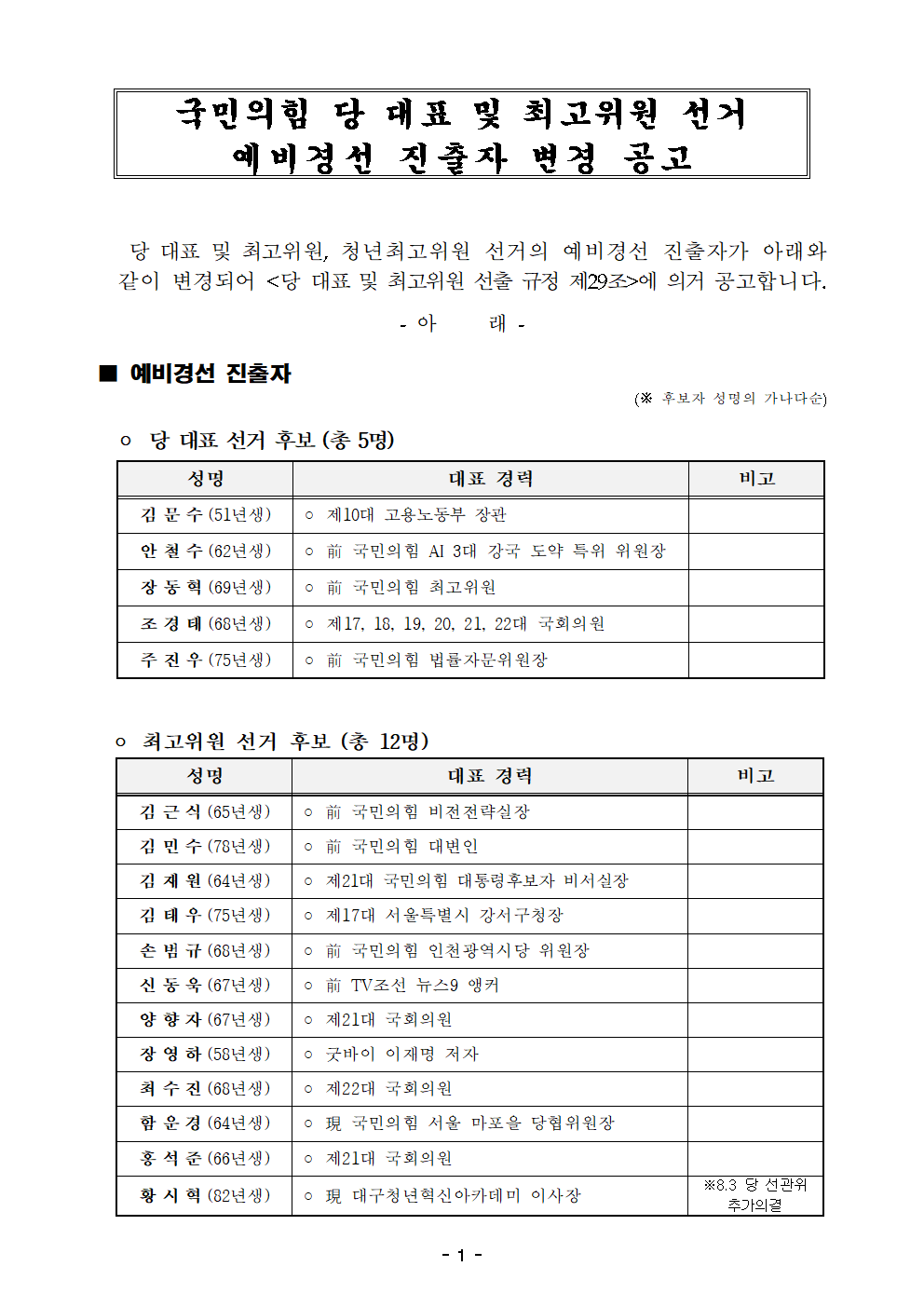 국민의힘 당 대표 및 최고위원 선거 예비경선 진출자 변경 공고