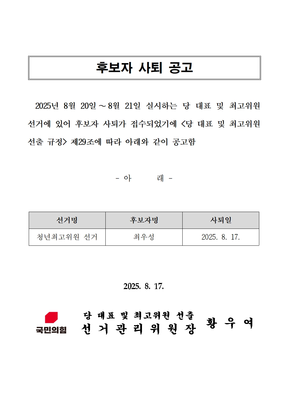 당 대표 및 최고위원 선거 후보자 사퇴 공고