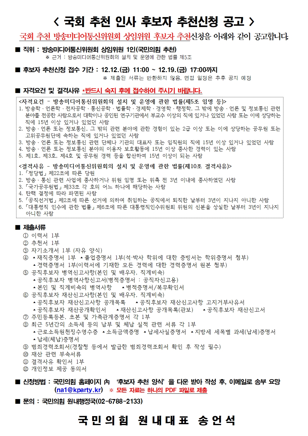 국회 추천 인사 후보자 추천신청 공고(방송미디어통신위원회 상임위원)