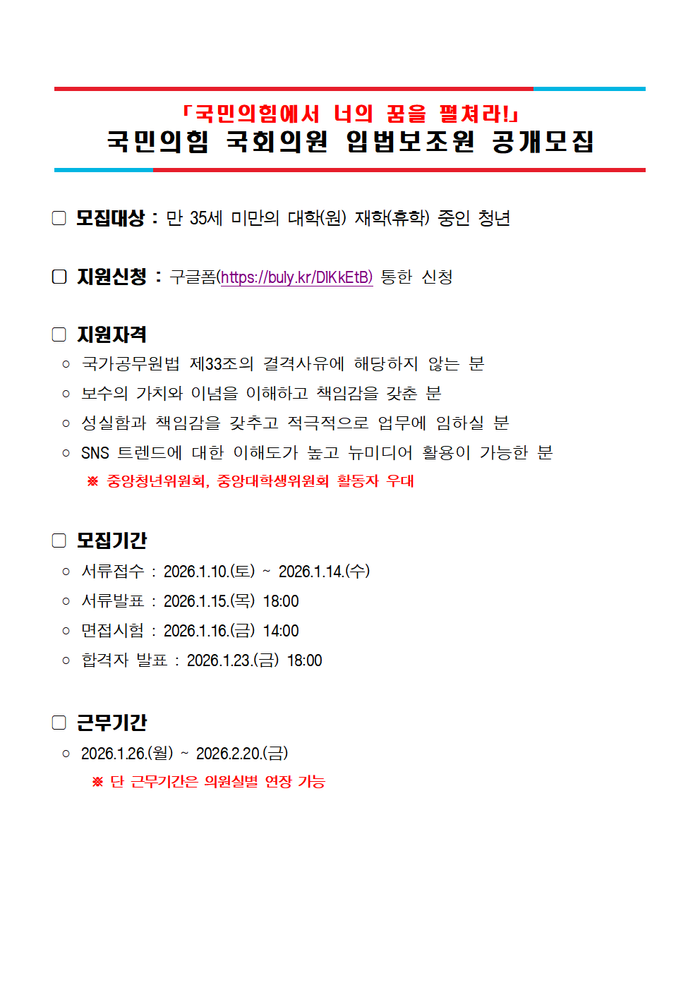 「국민의힘에서 너의 꿈을 펼쳐라!」 국민의힘 국회의원 입법보조원 공개모집