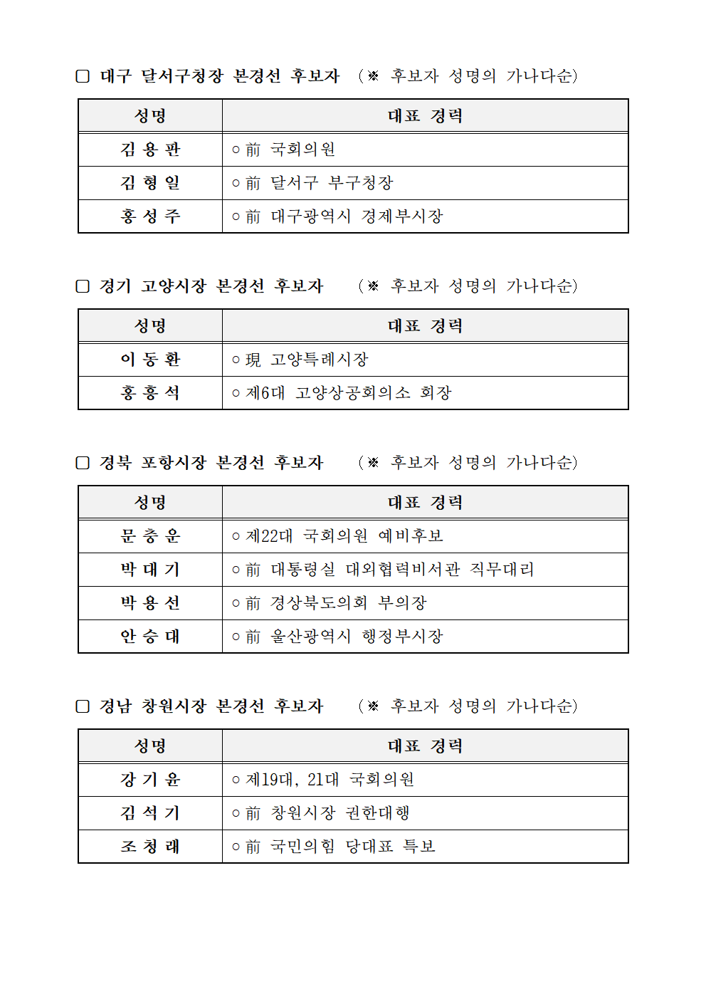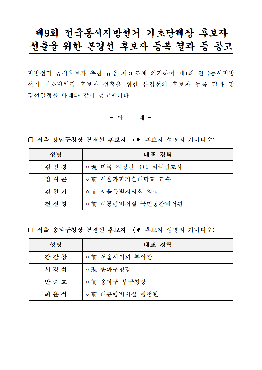 제9회 전국동시지방선거 기초단체장 후보자 선출을 위한 본경선 후보자 등록 결과 등 공고