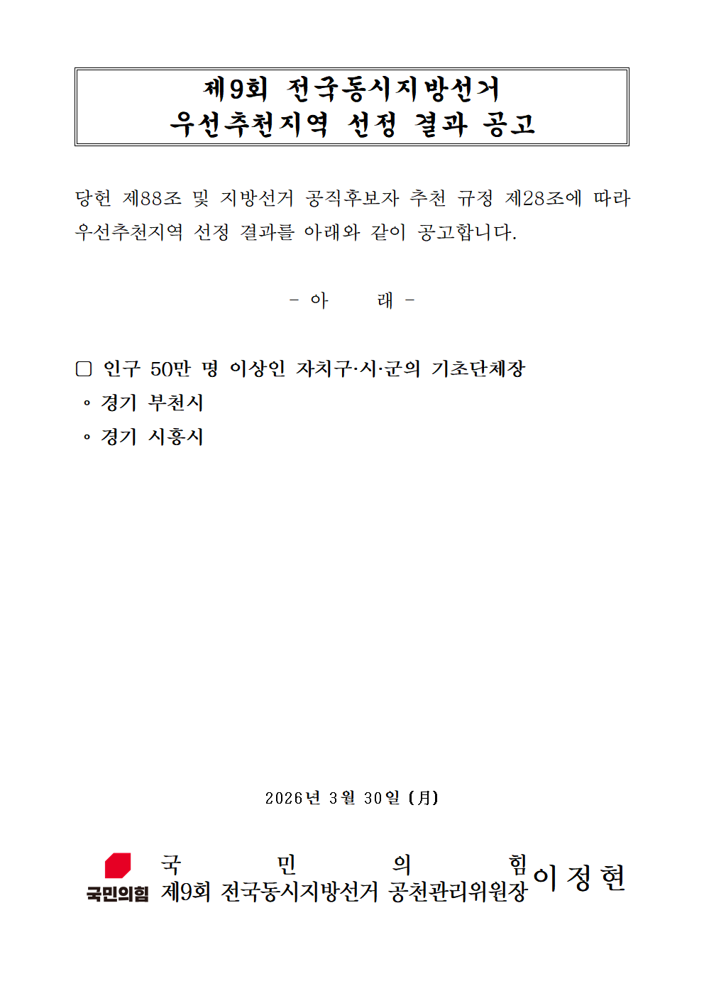 제9회 전국동시지방선거 우선추천지역 선정 결과 공고