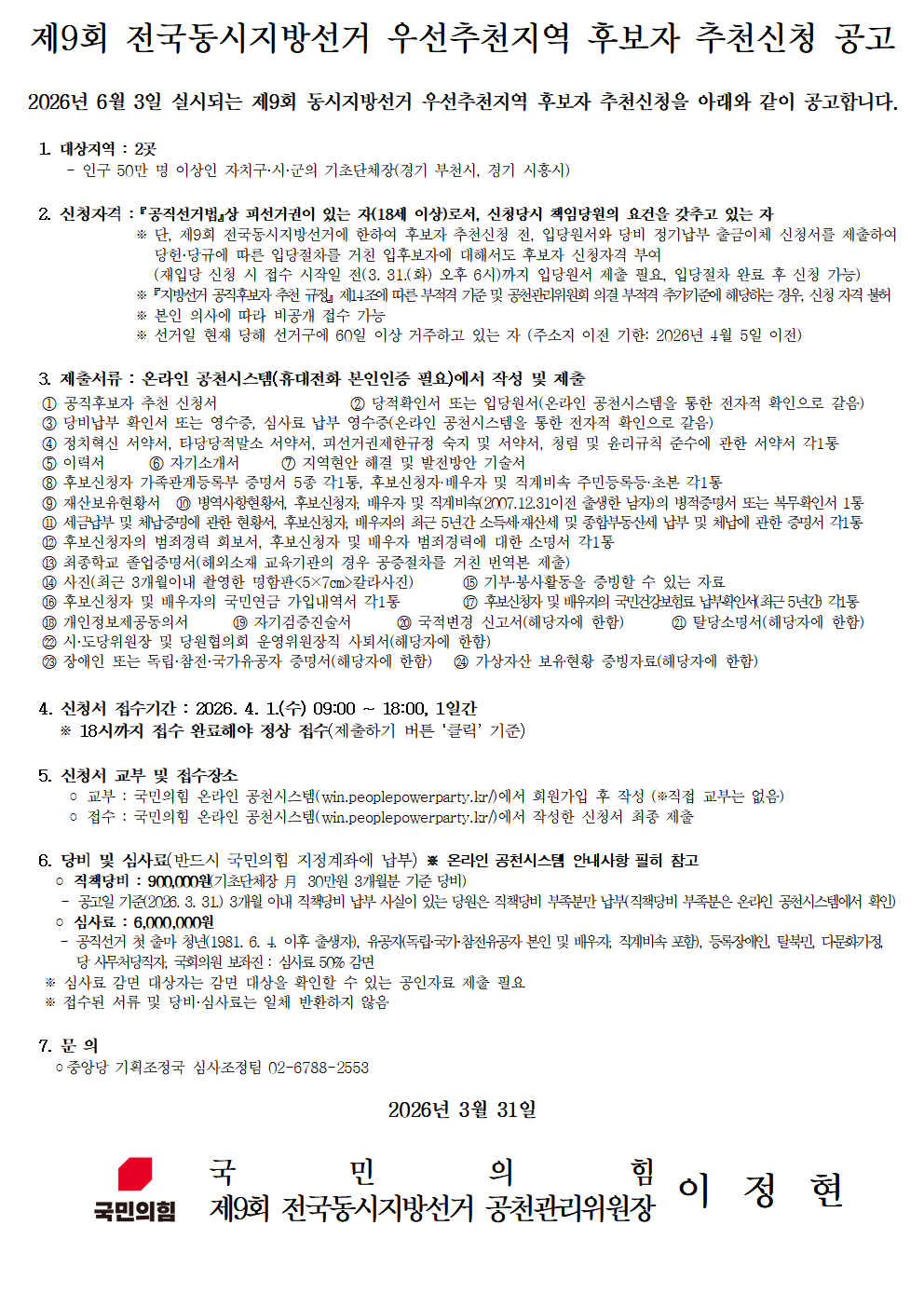 제9회 전국동시지방선거 우선추천지역 후보자 추천신청 공고