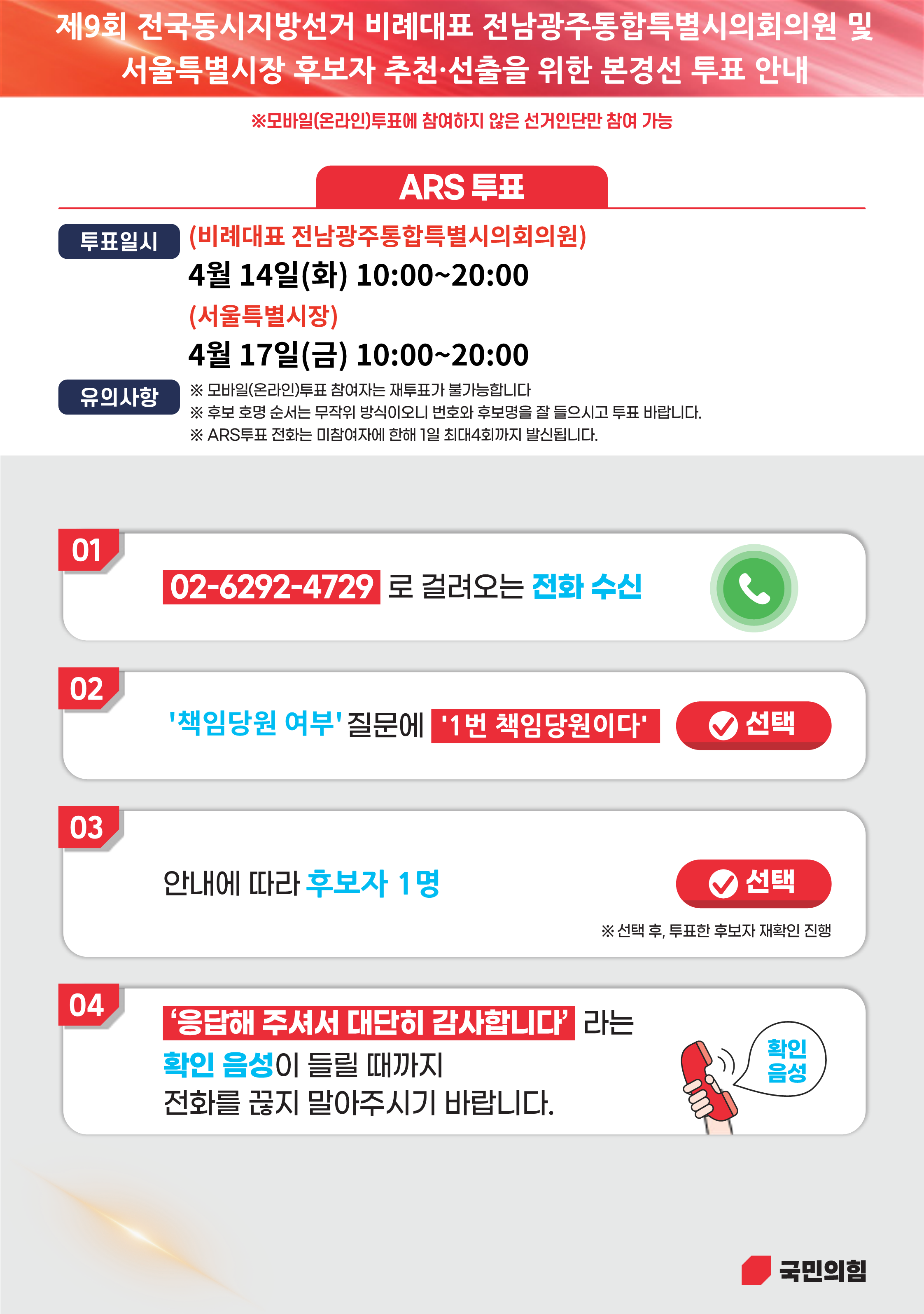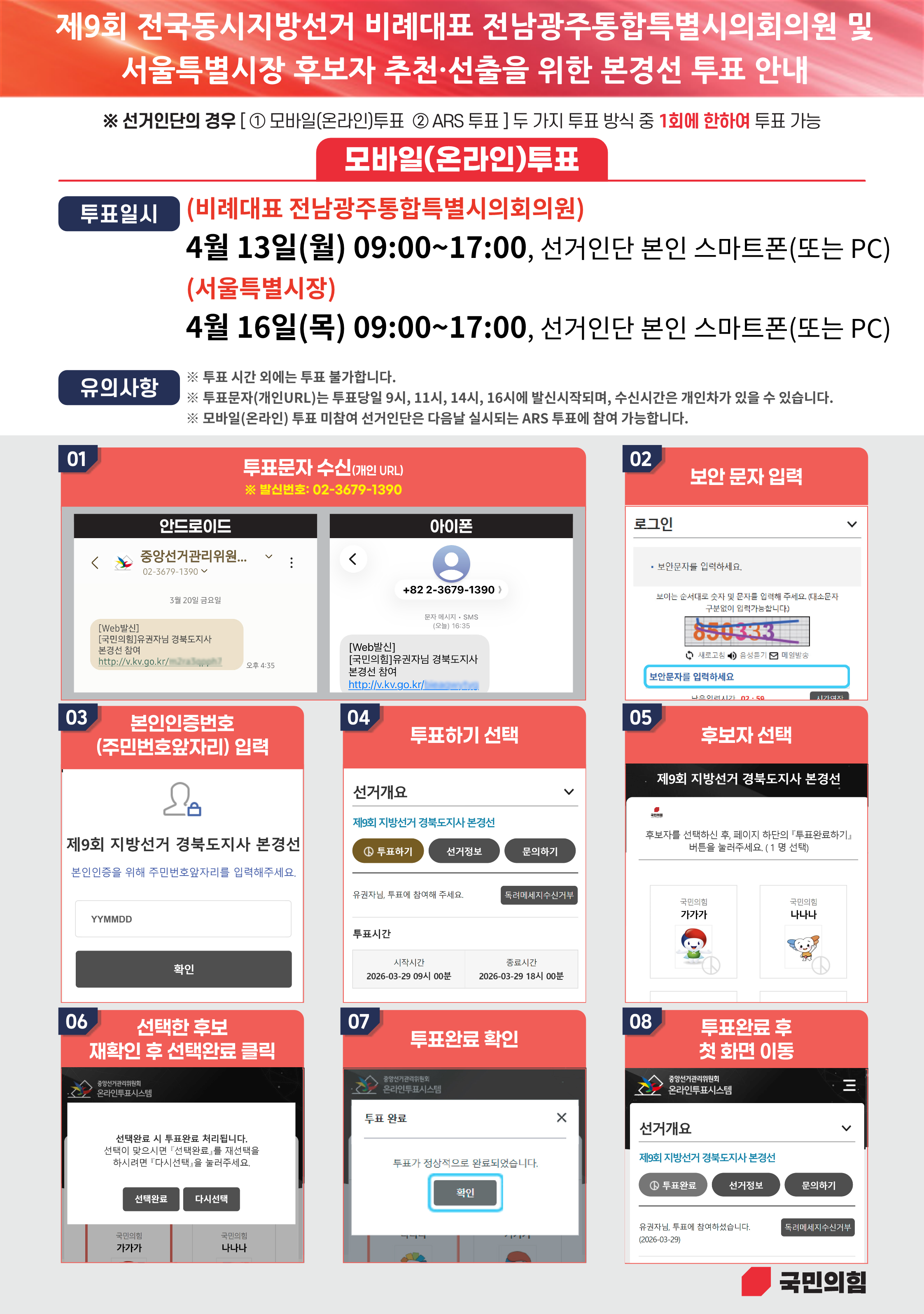 제9회 전국동시지방선거 비례대표 전남광주통합특별시의회의원 및 서울특별시장 후보자 추천·선출을 위한 본경선 투표 안내