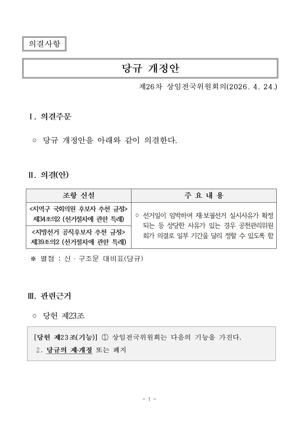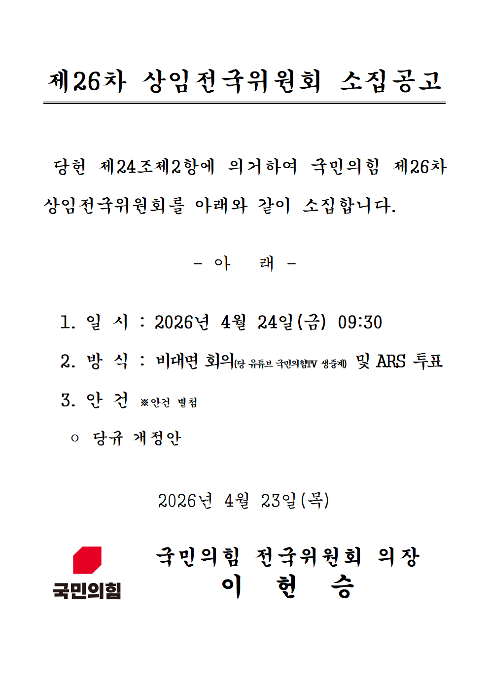 제26차 상임전국위원회 소집 공고