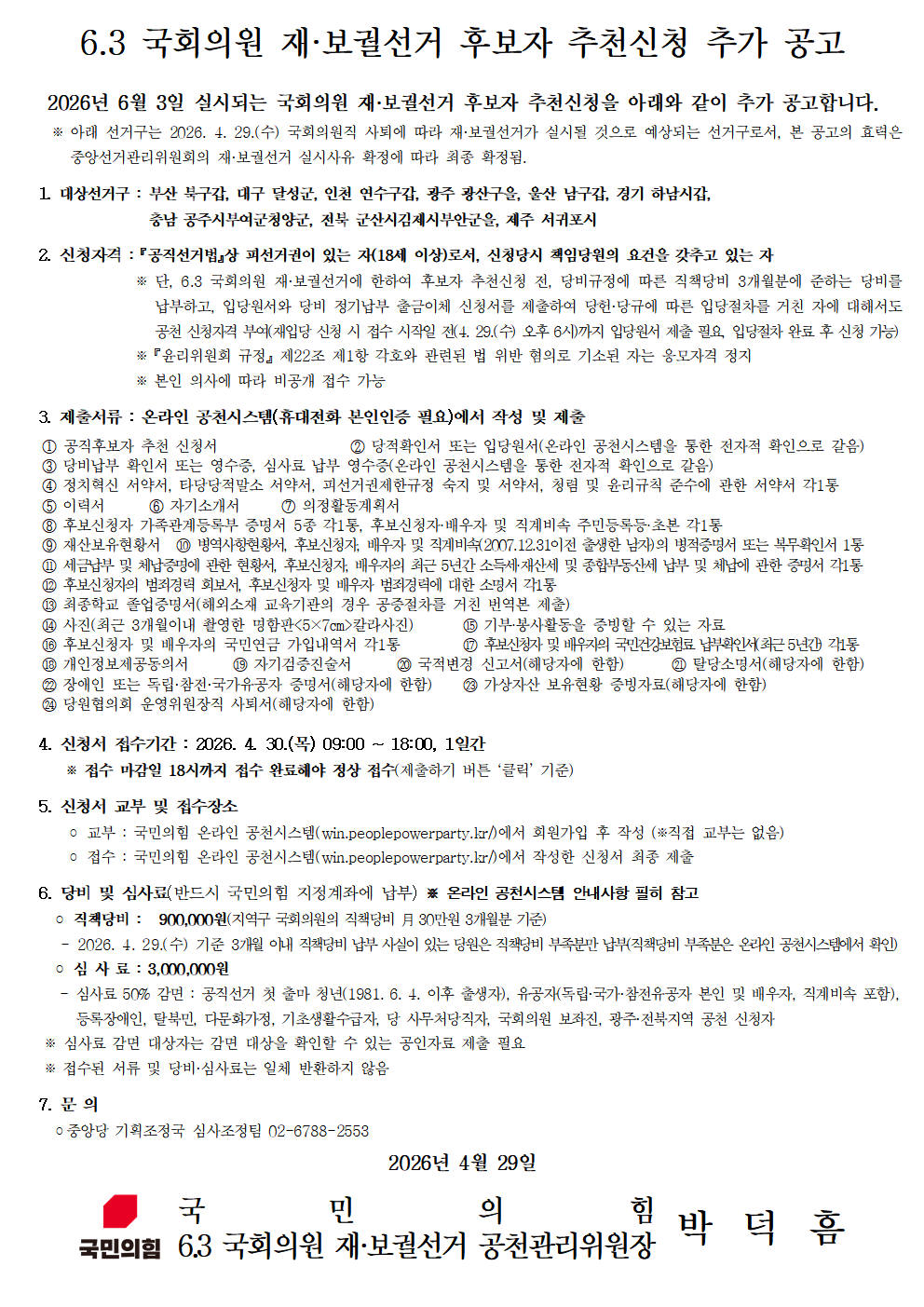 6.3 국회의원 재·보궐선거 후보자 추천신청 추가 공고