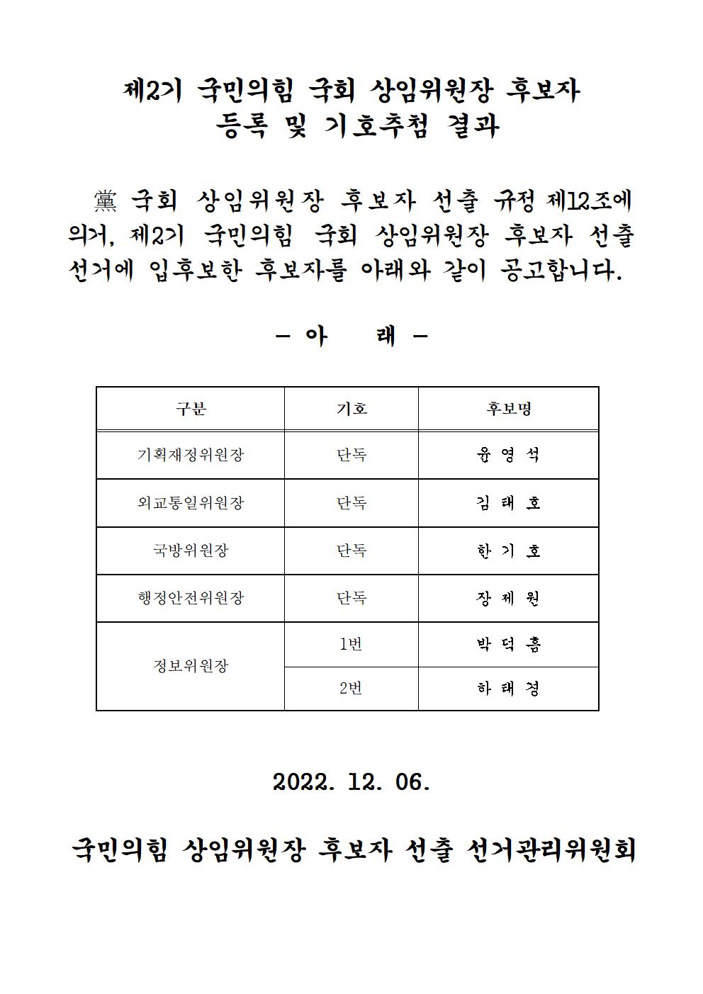 제2기 국민의힘 국회 상임위원장 후보자 등록 및 기호추첨 결과